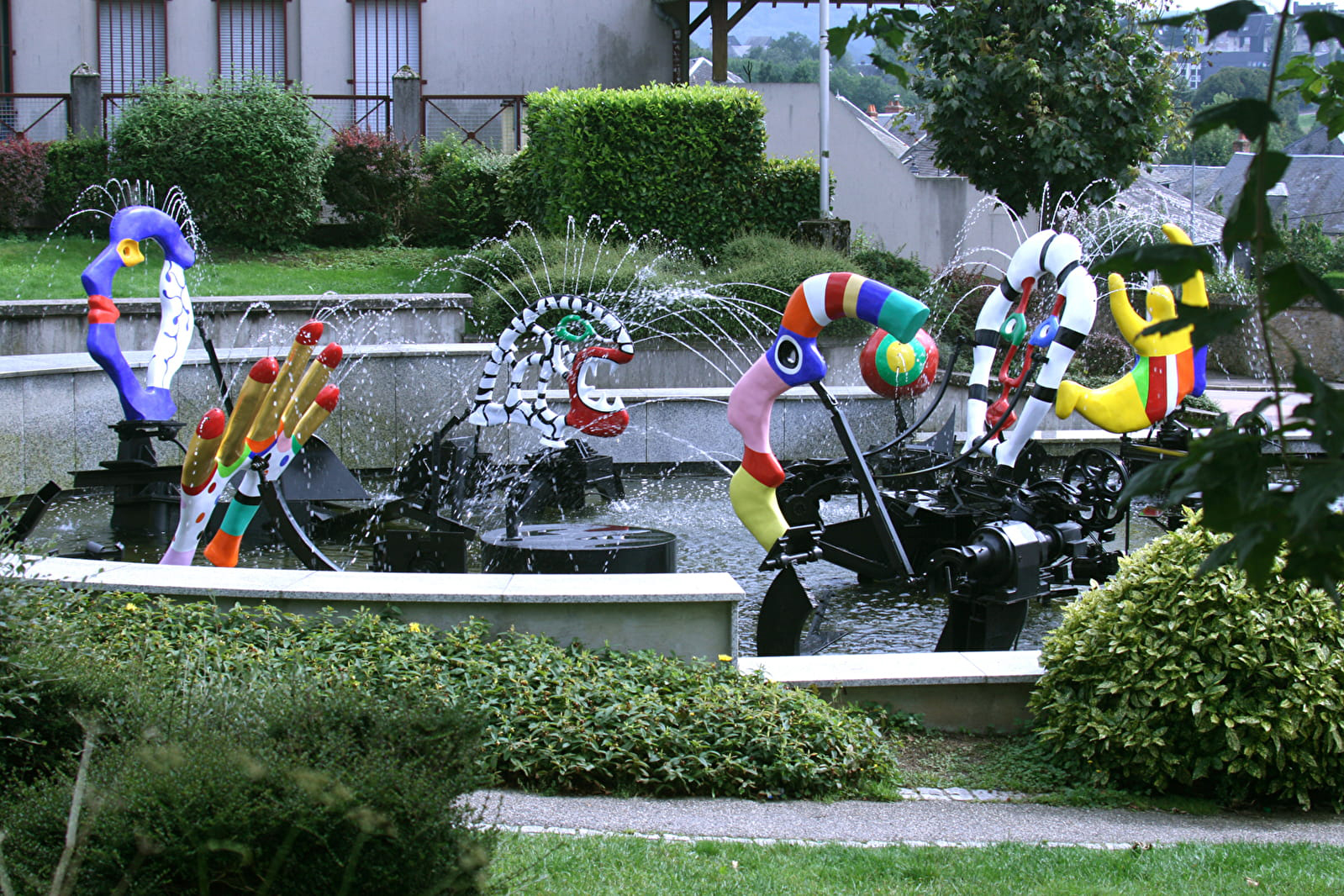 In the French village of Château-Chinon is another fountain installation, this one a collaboration between Jean Tinguely and Niki de Saint Phalle. It is named Fontaine de Château-Chinon and was commissioned by former French president (and mayor of the town) Francois Mitterand in 1988. The fountain, located in front of the former courthouse includes 8 sculptures created by Saint Phalle that are set in motion by Tinguely’s kinetic machines.